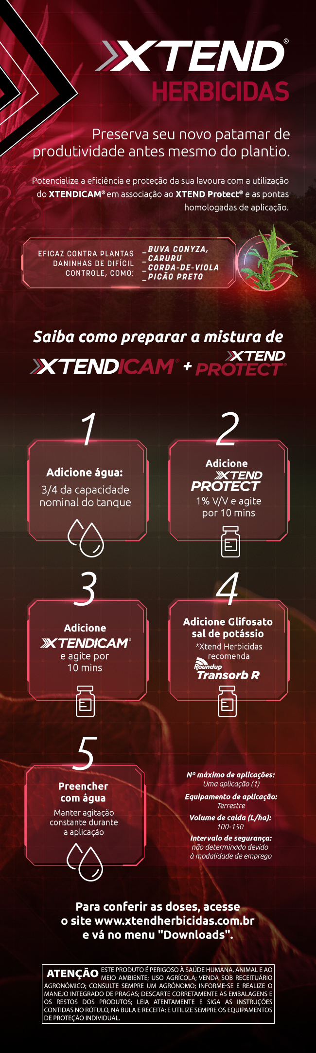 Recomenda-se o uso da biotecnologia INTACTA2 XTEND® combinada com XTENDICAM® para otimizar a eficiência e potencializar o valor na dessecação. Uso exclusivo em variedades tolerantes: INTACTA2 XTEND® e XTEND® Biotec.